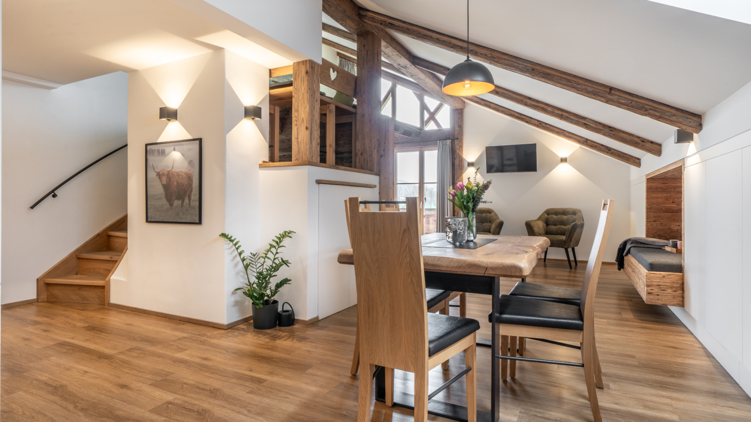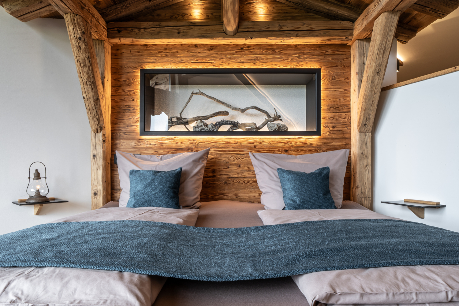 Viel Platz und wenig Wände – dafür Panorama-Aussicht von der Doppel-Badewanne oder dem Doppelbett im almerischen Stil (in der FeWo „Isarursprung“).